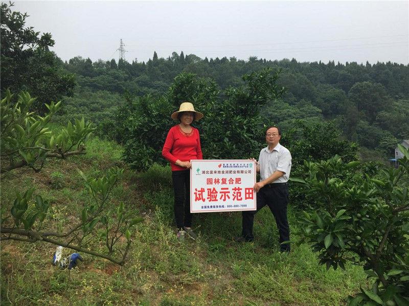 圖為試驗(yàn)示范田:宜昌市夷陵區(qū)小溪塔街辦倉屋榜村(右三)江繼蘭(15327615640)家的柑橘田,據(jù)該種植戶反映,湖北富來地金潤肥業(yè)有限公司生產(chǎn)的40%(22-5-13)柑橘專用肥,產(chǎn)品顆粒均勻,水溶性好,試驗(yàn)示范田的小果與對(duì)照田相比個(gè)頭較大、有光澤。